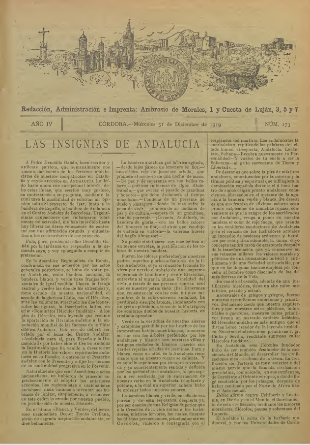 En la Asamblea Regionalista de Ronda, confirmada en sus acuerdos por los actos generales posteriores, se hubo de votar para Andalucía, como bandera nacional, la bandera blanca y verde (tres franjas horizontales de igual medida: blanca la franja central y verdes las dos de los extremos) y, como escudo de nuestra nacionalidad, el escudo de la gloriosa Cádiz, con el Hércules, ante las columnas, sujetando los dos leones; sobre las figuras, la inscripción latina, en orla: «Dominátor Hércules fundátor». A los pies de Hércules, esta leyenda que resume la aportación de Hércules andaluz a la superación mundial de las fuerzas de la Vida: «Bética-Andalus». Este escudo deberá ser orlado por el lema del Centro Andaluz: «Andalucía para sí, para España y la Humanidad» por haber sido el Centro Andaluz la Institución que ha venido a desenterrar en la Historia los valores espirituales andaluces en lo Pasado; a entroncar el Pretérito andaluz con lo Presente y a fijar las normas de su continuidad progresiva en lo Porvenir.