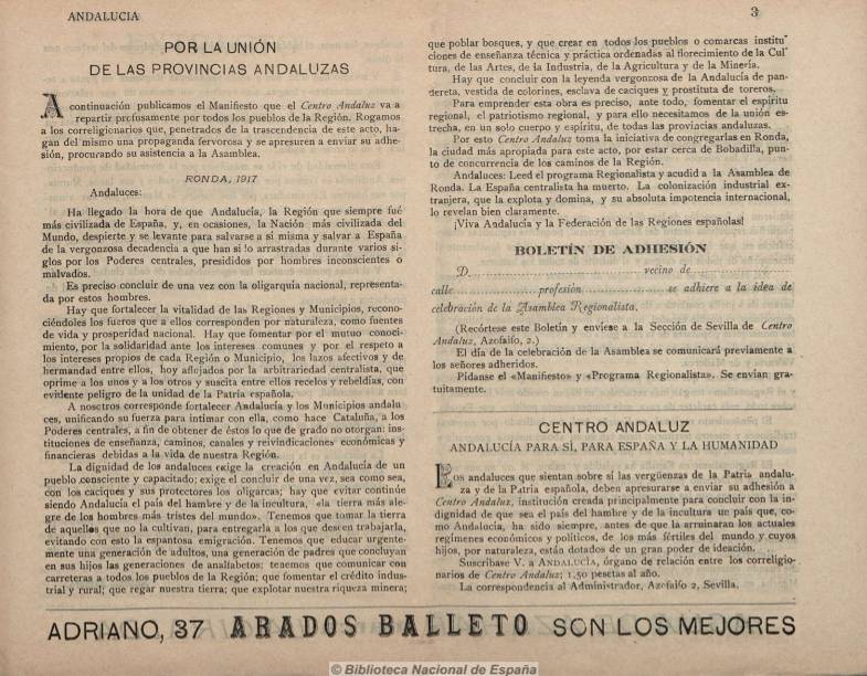 Texto del Manifiesto publicado en el número 8 de la revista ‘Andalucía’ (enero, 1917) en el que el Centro Andaluz convocaba a los ciudadanos a participar en la Asamblea de Ronda.