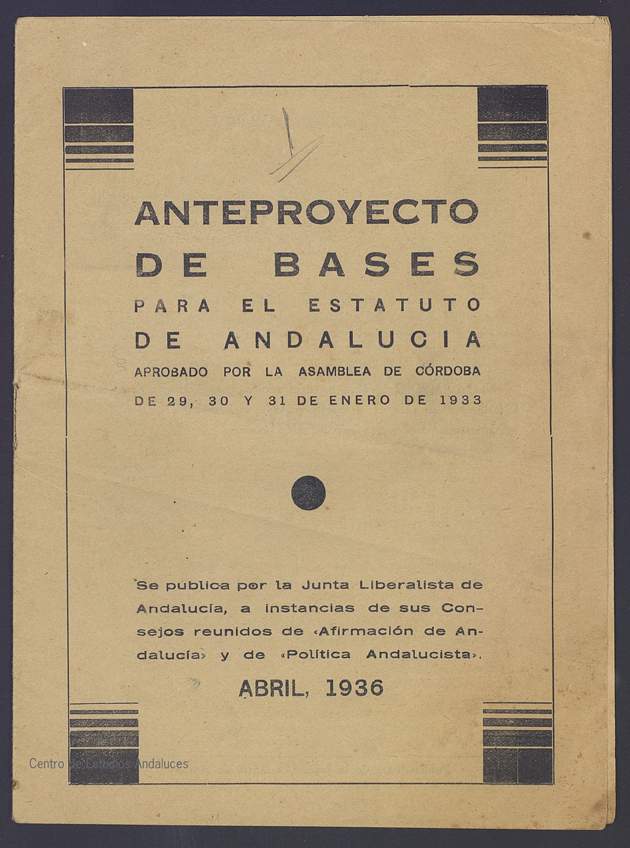 Este folleto formaba parte de la documentación de la Comisión Gestora de la Asamblea Regional Andaluza de 1933, que se entregó a los asistentes a la Asamblea de Córdoba en enero de 1933.