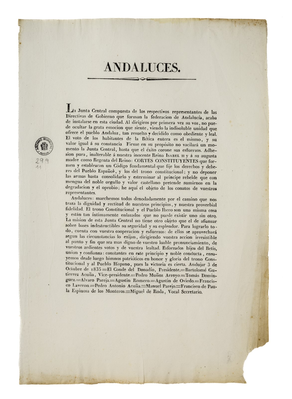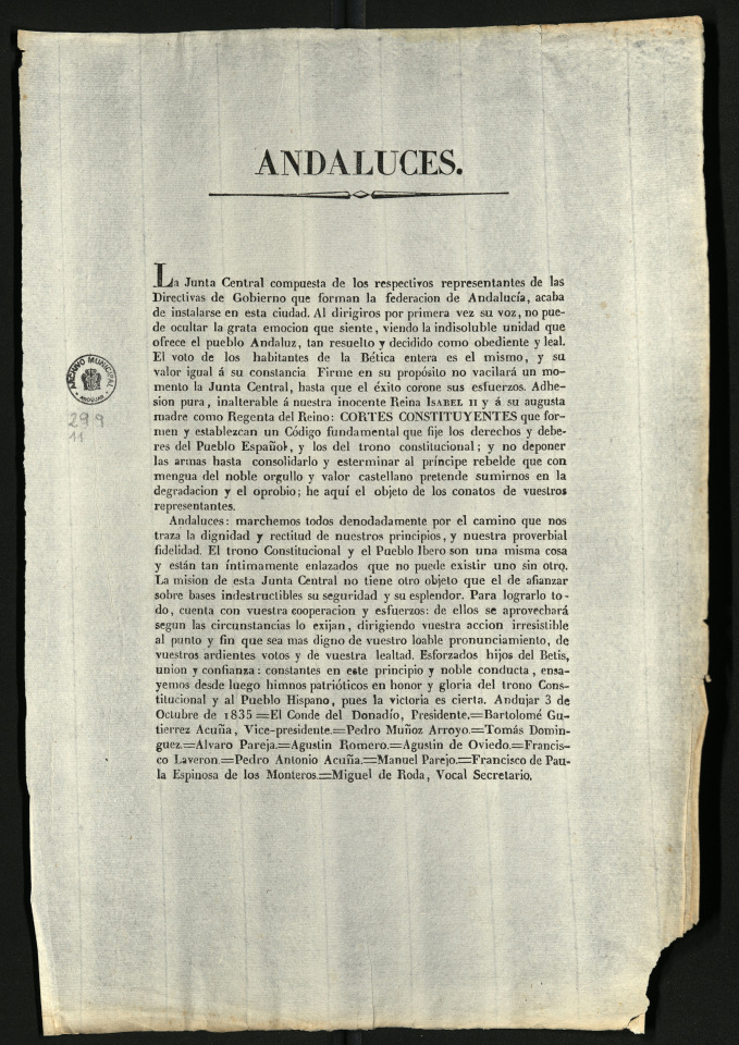 La sala 28F exhibe el documento impreso de la proclama ‘Andaluces’, suscrita en Andújar el 3 de octubre de 1835, cedido temporalmente por el Archivo Municipal de Andújar. Se expone junto a la reproducción de la versión manuscrita, conservada en la Real Academia de la Historia.