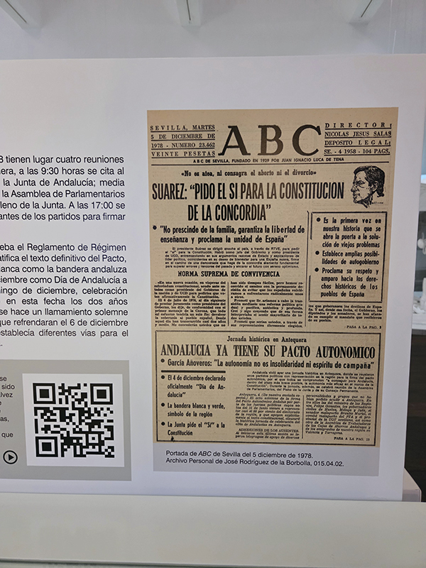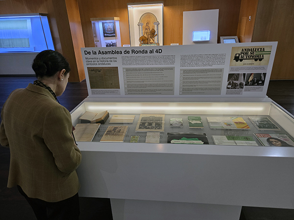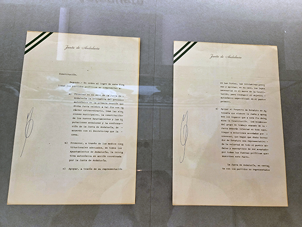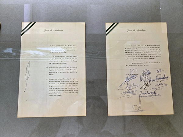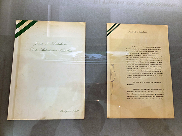 Ocupa un lugar destacado en esta muestra el ejemplar original del Pacto Autonómico Andaluz, conocido como el Pacto de Antequera, donado en el mes de abril al Museo de la Autonomía de Andalucía por Carmela Gálvez Santisteban, persona de confianza del que fuera presidente de la Junta preautonómica de Andalucía Plácido Fernández Viagas, impulsor y artífice del consenso que propició la firma de este pacto. El 4 de diciembre de 1978 se rubricaba en Antequera este acuerdo suscrito por las once fuerzas políticas presentes en ese momento en la vida pública andaluza cuyo objetivo era lograr la autonomía plena.