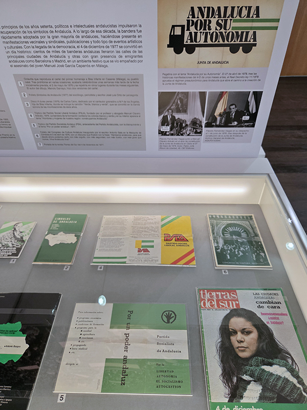 Junto a las vitrinas expositivas, se han habilitado en la Sala 28 F unas pantallas para que los visitantes puedan acceder a una serie de recursos complementarios sobre la histórica fecha del 4 de diciembre. Por una parte, un video testimonial de Carmela Gálvez que relata el pulso de aquellos días en que Andalucía soñaba con ser dueña de su destino y, por otra parte, una selección de fragmentos procedentes del documental ‘4D. El día de la bandera’, producido por 16 Escalones, que recorren los acontecimientos y personajes clave de aquella etapa histórica en la que se consiguió el Estatuto de Autonomía.
