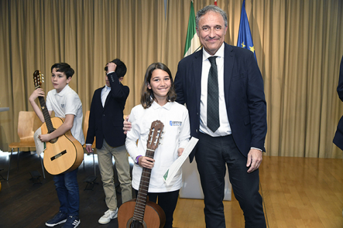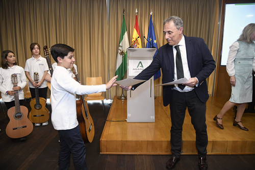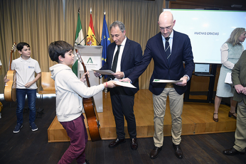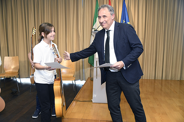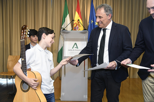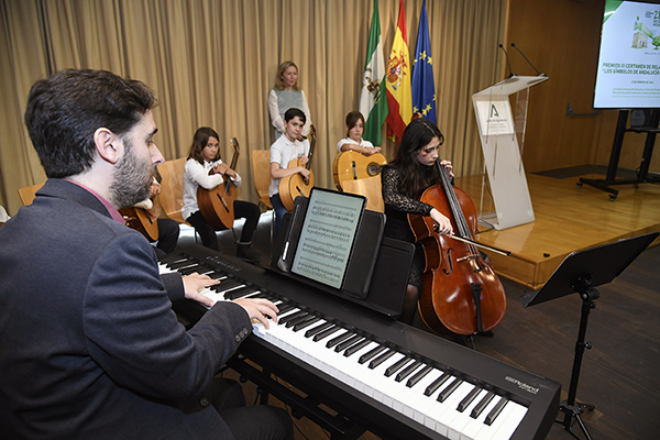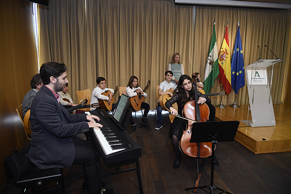 La jefa del Servicio de Ordenación y Evaluación Educativa Olga Ruiz Dana cerró el acto de entrega de premios que contó con la interpretación de distintas piezas musicales a piano, chelo y guitarra. de los alumnos del Conservatorio Elemental de Musical Pedro Gámez Laserna de Coria del Río, dirigido por Emilio Guerrero. El acto se cerró con una versión del himno de Andalucía con guitarra española a cargo del alumno Faustino Cabello.