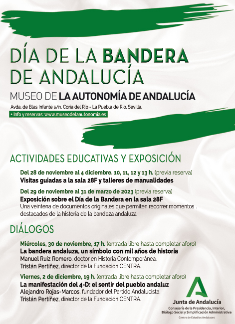 La Fundación Centro de Estudios Andaluces (CENTRA), encargada de conservar y difundir el legado de Blas Infante, ha ideado una serie de actividades para el Día de la Bandera que comenzarán el 28 noviembre hasta el 4 de diciembre. Incluirá actividades educativas destinadas a escolares y familias, visitas guiadas a la sala 28 F y talleres de manualidades sobre la bandera con reserva gratuita a través de esta página web.