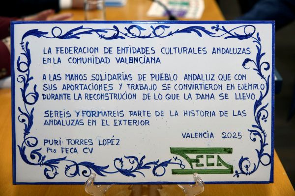 Al acto celebrado hoy en el Museo de la Autonomía de Andalucía han asistido, entre otras autoridades, el director general de Andalucía Global, Jorge Vázquez; la delegada territorial de Turismo, Cultura y Deporte en Sevilla, Carmen Ortiz; y el director de la Fundación Centro de Estudios Andaluces, Tristán Pertíñez, quien ha recibido la donación de una placa conmemorativa por parte de la FECACV al Museo de la Autonomía de Andalucía: La Federación de Entidades Culturales Andaluzas en la Comunidad Valenciana, a las manos solidarias del pueblo andaluz que con sus aportaciones y trabajo se convirtieron en ejemplo durante la reconstrucción de lo que la DANA se llevó. Seréis y formaréis parte de las andaluzas en el exterior. Valencia, 2025.